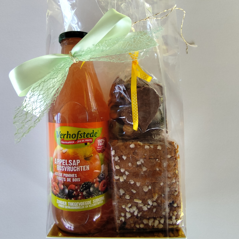 Trakteer jezelf of iemand anders op het pakket Zoet Genieten, gevuld met heerlijke vruchtensap, ambachtelijke peperkoek en pralines, puur genot in elke hap!